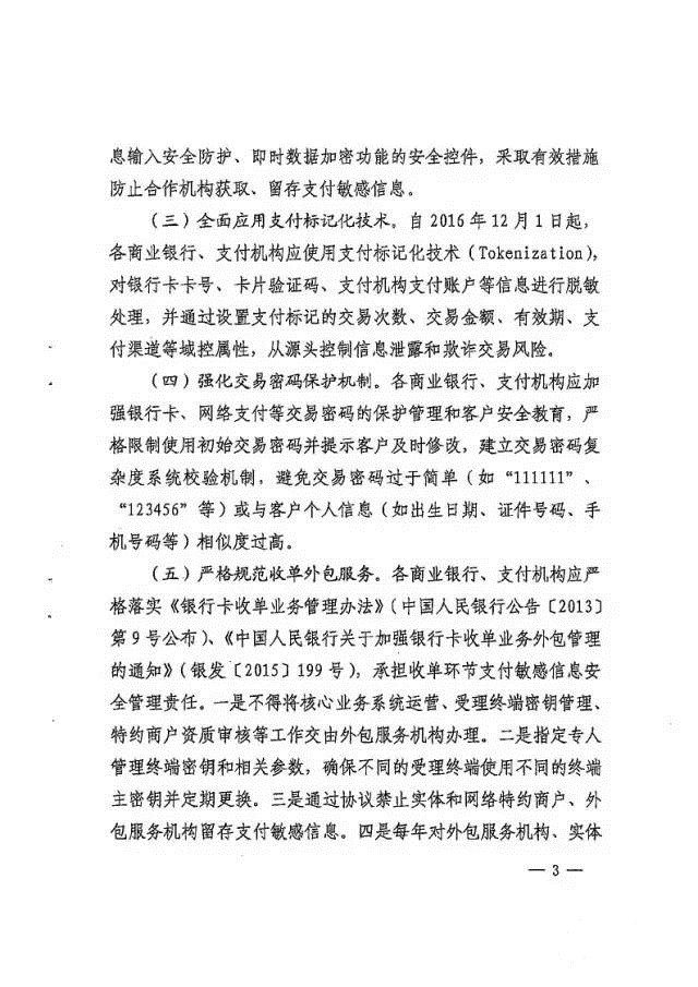 2016年12月1日起全面实行支付技术标记化处理支付机构应使用支付标记化技术 , , ,对银行卡卡号 、卡片验证码 、支付机构支付账户等信息进行脱敏处理 , , ,并通过设置支付标记的交易次数 、交易金额 、有效期 、支付渠道等域控属性 , , ,防范交易风险!
